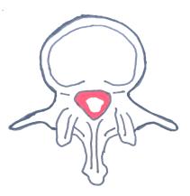 Zie boven afbeelding wervel van boven, in rood stenose in wervelkanaal